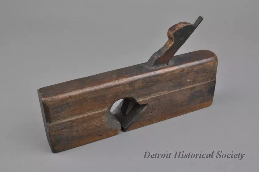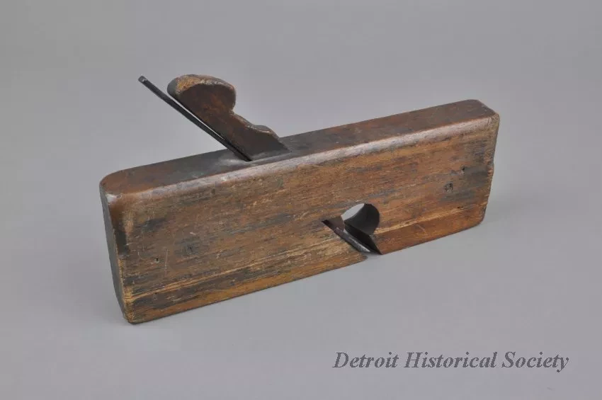 Rabbet Plane. Small with a steel cutting blade running through the middle. There is a chamfered hole in the center two inches in diameter. Note: Tools belonged to Jay C. Freeman, carpenter b. Canton Twp. March 31, 1856 died july 11, 1942: moved to Detroit c. 1889.