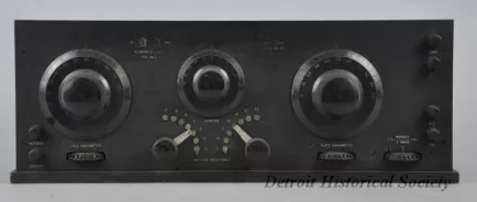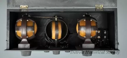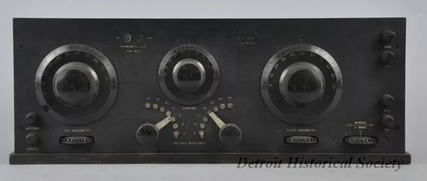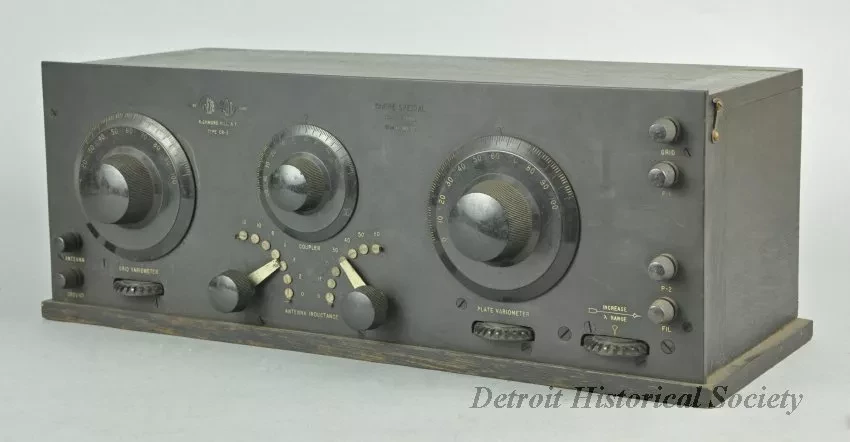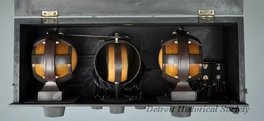Broadcast radio tuner Grebe Type CR-3. Serial number 157. Case is dark wood with lid hinged at rear. Front panel is made of slate. The unit is used in association with another box, which has the tubes, and the front plate controls, the front panel controls are grid variometer, coupler, and plate variometer, and there's a device for changing the wavelength range, or adjusting the wave length range, in association with the antenna. The radio tuner contains three semi-spherical tuning coils controlled by large dials on the slate. There are two dials for antenna inductance rheostats and six wire terminals.