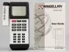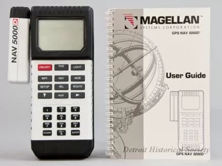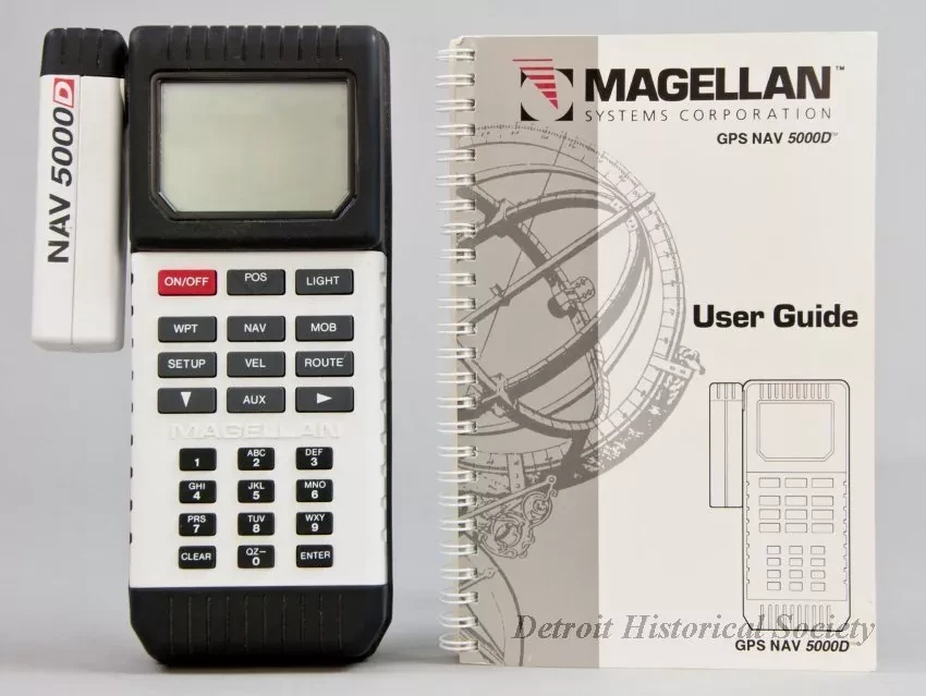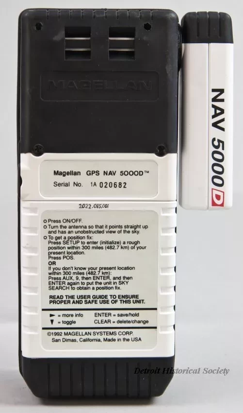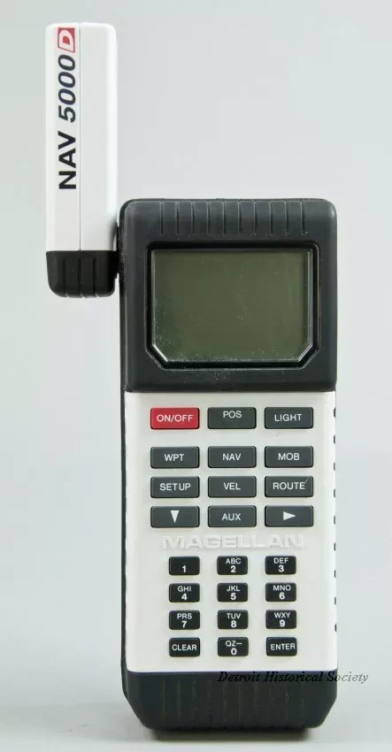 One "NAV 5000D" global positioning receiver made by Magellan Systems Corporation. The battery-operated handheld receiver was designed for marine use and has a white plastic watertight body that floats. It has been reinforced with black rubber at the upper and lower ends and around the display screen. The front surface of the receiver has a small display screen at the top, various control keys at the center and an alphanumeric keypad at the bottom. An antenna is contained in a short, square-shaped tube that is located at the upper left side of the receiver. The tube is attached to the receiver body at one end and can be rotated upward. A cable port connection is located beneath a black rubber covering on the center right side of the receiver. The back of the receiver has a white adhesive label with black printed text that reads "Magellan GPS NAV 5000D," and shows the serial number, "1A 020682." An adjacent adhesive label has black printed text which gives basic start-up and operating instructions.