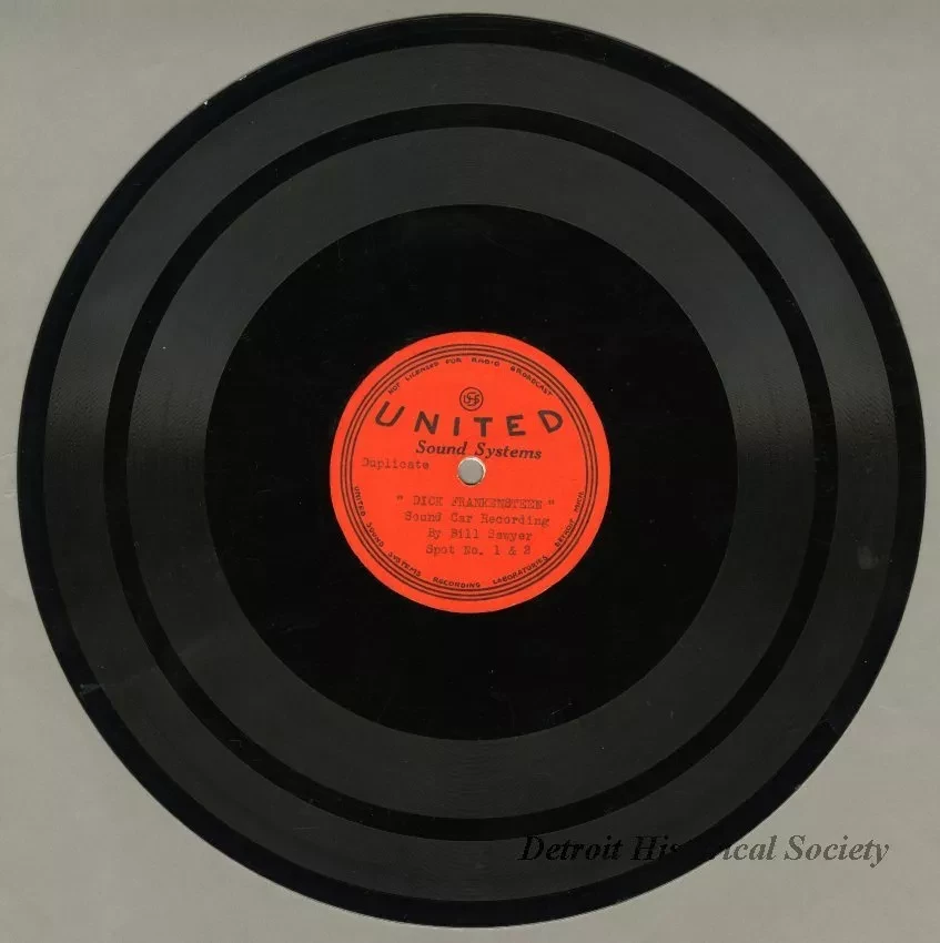 One phonograph record. The 78 rpm record has a red label with black text that shows "United Sound Systems" and "United Sound Systems Recording Laboratories, Detroit, Mich." A typewritten title on the label shows "Duplicate, Dick Frankensteen, Sound Car Recording by BIll Sawyer, Spot No. 1 & 2." The label on the verso is identical except that it shows "Spot No. 3 & 4."; no sleeve or album.