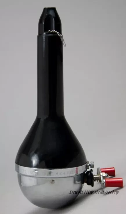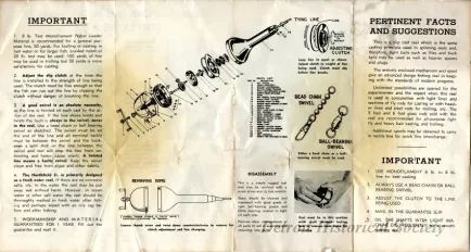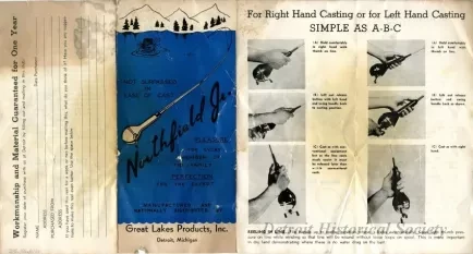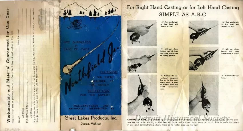 One "Great Lakes Whirlaway Reel" made by Great Lakes Products, Inc., of Detroit. This "Northfield Jr." model has a handle assembly with a wide, dome-shaped base that is made of stainless steel or chrome-plated brass. A metal hand crank with two red plastic finger rests is located on one side of metal base. The upper portion of the base is made of black plastic which tapers to form a cylindrically-shaped handle that is approximately 1.25 inches in diameter. The top end of the handle has a 0.375-inch diameter, 1.875-inch deep hole with two set screws on the side for attaching a rod (missing) to the reel handle assembly. A short section of beaded chain is tied to the end of a fishing line that protrudes from a small opening near the top end of the plastic handle. The fishing line and reel parts are held inside the handle assembly which can be opened by a small metal thumbscrew that is located near the reel hand crank. Stamped text along the edge of the metal base reads "Great Lakes Products, Inc., Detroit, Mich.," and "Pat. 2299156." A 4-fold brochure was included with the fishing reel which gives operating instructions and a parts diagram.