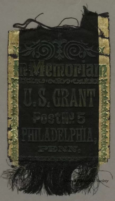 Request ImageCommemorative ribbon badge printed with "In Memoriam - U.S. Grant, Post No. 5, Philadelphia, Penn." in gold on black with beige trim.