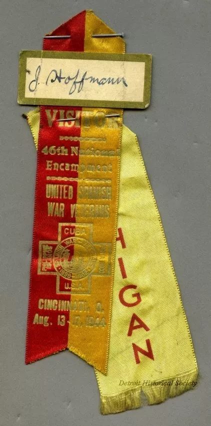 1 - Ribbon worn by United Spanish War Veteran (USWV), Joseph Hoffman. The ribbon has a a paper name tag at the top with handwritten text: "J. Hoffman", a red and yellow vertically-striped ribbon hangs below which has a cross emblem and printed text: "Visitor 46th National Encampment United Spanish War Veterans Cincinnati, O., Aug. 13-17, 1944", a second yellow ribbon is attached with red letttering: "Michigan".