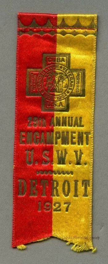 1 - Ribbon worn by United Spanish War Veteran (USWV), Joseph Hoffman. The red and yellow vertically-striped ribbon has a cross emblem with gold lettering: "20th Annual Encampment U.S.W.V. Detroit 1927", a paper tag on the back shows: "This Badge Manufactured by the Whitehead & Hoag Co. Makers of Badges, Buttons, Banners, Signs, and Advertsing Novelties. Main Office and Factory Newark New Jersey."
