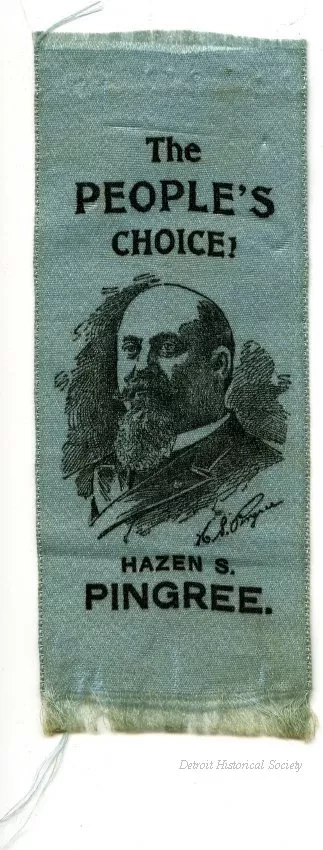 One satin or silk political campaign ribbon. The ribbon is made of light blue satin or silk that has finished edges on the left and right sides and short fringe on the top and bottom edges. The silk is stamped in black ink with a head and shoulders image of a man who has a beard. The printed text, "The People's Choice!" is shown above the image and "Hazen S. Pingree" is shown below the image.