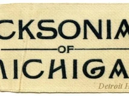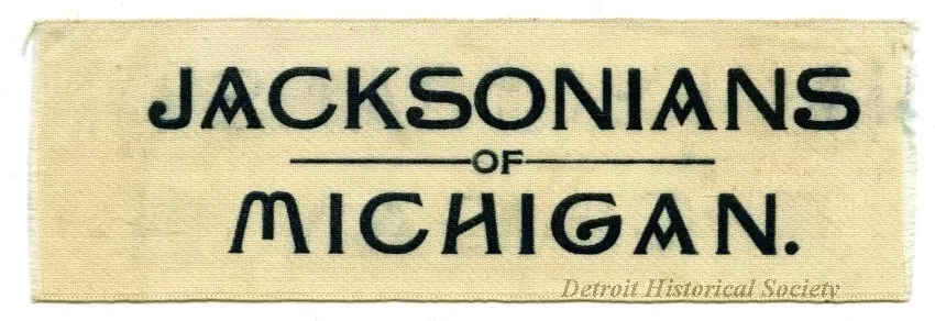 One satin or silk political campaign ribbon. The ribbon is made of off-white satin or silk that has finished edges on the top and bottom sides and short fringe on the left and right sides. The silk is stamped in black ink with printed text that shows "Jacksonians of Michigan."