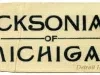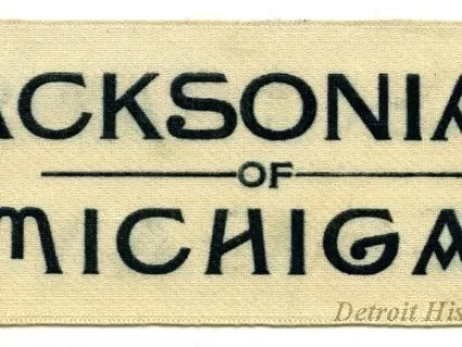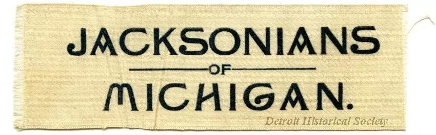 One satin or silk political campaign ribbon. The ribbon is made of off-white satin or silk that has finished edges on the top and bottom sides and short fringe on the left and right sides. The silk is stamped in black ink with printed text that shows "Jacksonians of Michigan."