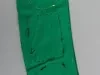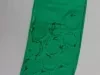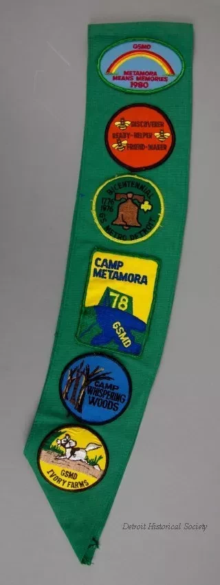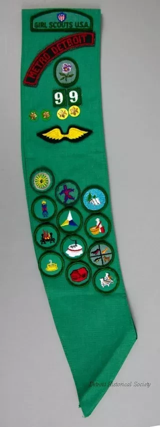One Girl Scouts award badge sash. The sash is made of a 4.5-inch wide strip of green cotton fabric with hemmed edges. It was worn over the right shoulder, around the torso, and ended at the left waist. Embroidered patches at the top show "Girl Scouts, U.S.A.," "Metro Detroit," troop number "99," a flower, and gold-colored wings. In addition, there are four brass star pins and twelve circular embroidered award badges. The back side of the sash has six large commemorative embroidered patches. No manufacturer's labels are shown.