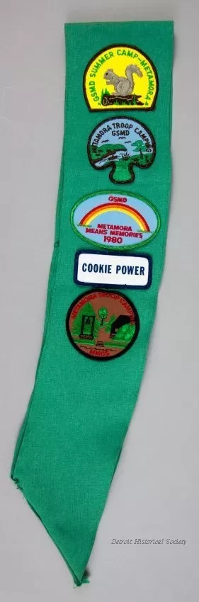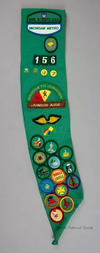 One Girl Scouts award badge sash. The sash is made of a 4.5-inch wide strip of green cotton fabric with hemmed edges. It was worn over the right shoulder, around the torso, and ended at the left waist. Embroidered patches at the top show "Girl Scouts, U.S.A.," "Michigan Metro," troop number "156," and a flower. In addition, there are four brass star pins, a "Junior Aide" badge, a gold-colored wings badge, and fourteen circular embroidered award badges. The back side of the sash has five large commemorative embroidered patches. No manufacturer's labels are shown.