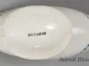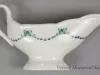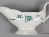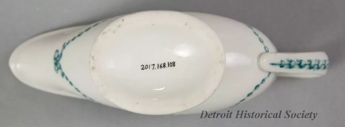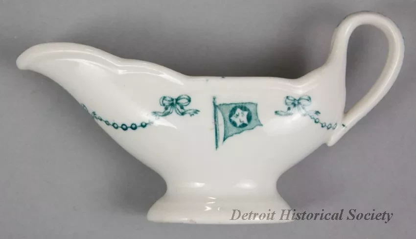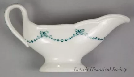 One small sauceboat from the dining room of the passenger steamship, SS Tashmoo, of the White Star Line. The narrow, oval-shaped sauceboat is made of white glazed china. It has an open top, a long spout, gently-curved sides, a curved handle with a green floral band on the outside, and an oval-shaped base. A small green bead and bow design is stamped on the sides in a scalloped arrangement. Also, a small green image of the company flag with the letters, "WSL," is stamped at the center of one side. No manufacturer's name or marks are shown.