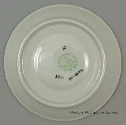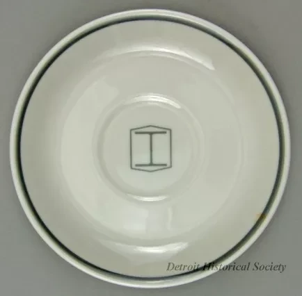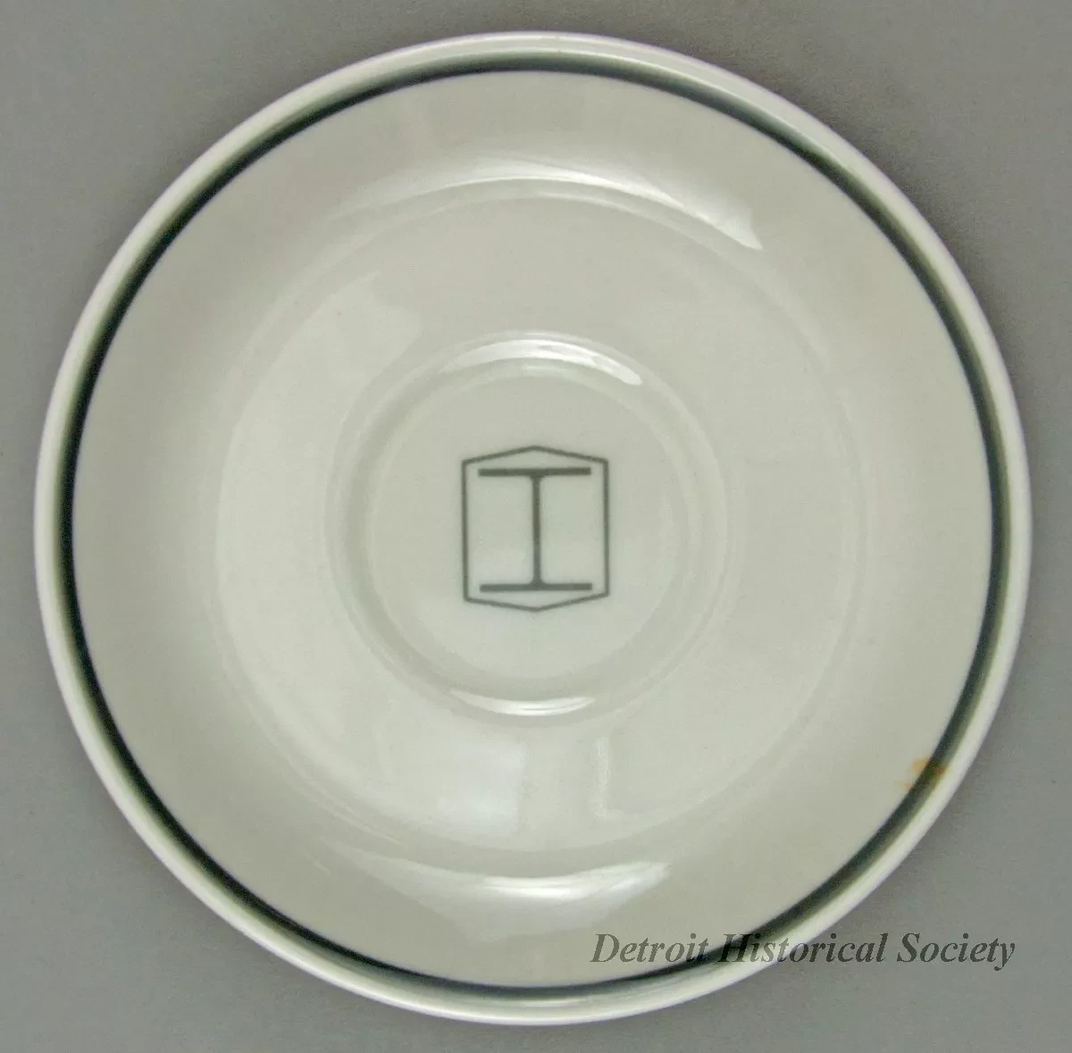 One saucer from the dining room of the M/V BURNS HARBOR of the Great Lakes Steamship Division of Bethlehem Steel Corporation. The saucer is made of heavyweight, white glazed china. It has curved sides and a thickened outer edge. A narrow gray stripe is located along the outer edge of the saucer, and the company "I-beam" logo is stamped in gray at the center. The underside is stamped with black text that reads "Shenango China, New Castle, PA, U.S.A.," and "Anchor Hocking, Inc.," as well as numbers, "AQ-45," "1043," and "71."