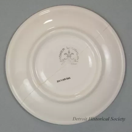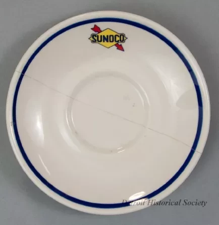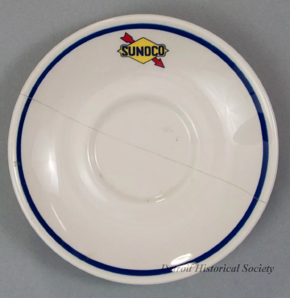 One saucer from the dining room of the tanker, Toledo Sun, of the Sun Oil Company (Sunoco). The saucer is made of heavyweight white glazed china. It has curved sides, a thickened outer edge, a circular depression on the top surface at the center, and a short circular base. A narrow blue stripe encircles the saucer near the outer edge. Also, a red/blue/yellow "Sunoco" logo is printed on the top surface near the outer edge. The underside is stamped with a fleur de lis logo and black text that reads "Homer Laughlin, B China," and "U.S.A"