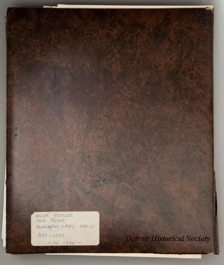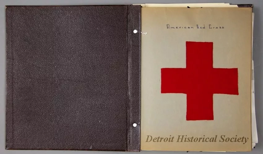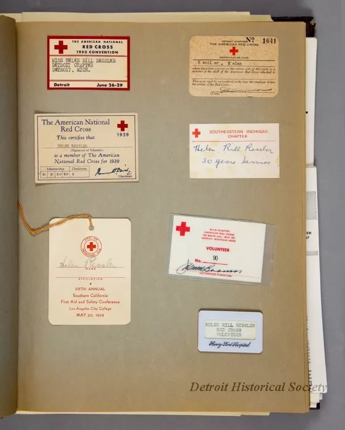 One scrapbook prepared by Helen R. Ressler that covers her career as a Red Cross volunteer and Henry Ford Hospital librarian. The scrapbook has two metal binding posts and cardboard covers which have brown paper coverings that have the look of simulated leather. Narrow gold-colored stripes are stamped along the borders of the front cover. The scrapbook contains approximately 30 pages of light gray, heavyweight paper that are covered with various mementos, certificates, photos, letters, brochures, newspaper clippings, and souvenirs. Items date from 1939 to about 1980, but mostly 1960's-1970's. Loose items are held in several folders at the back.