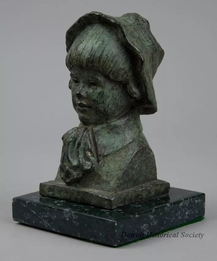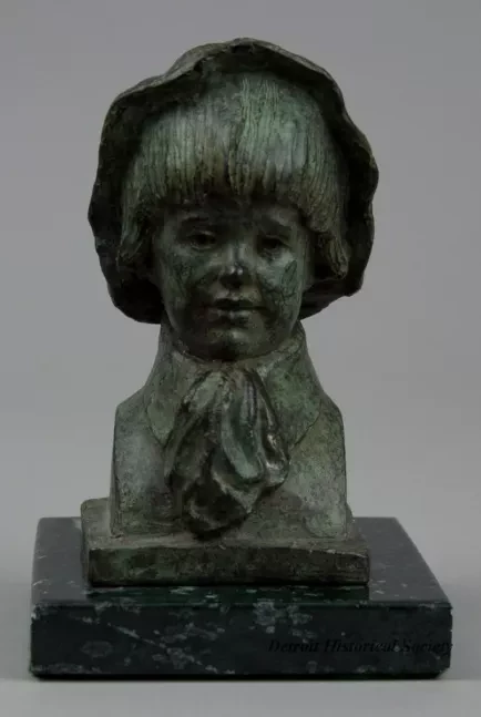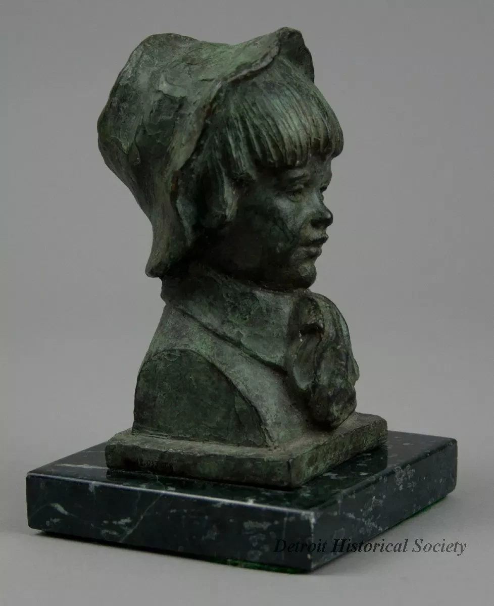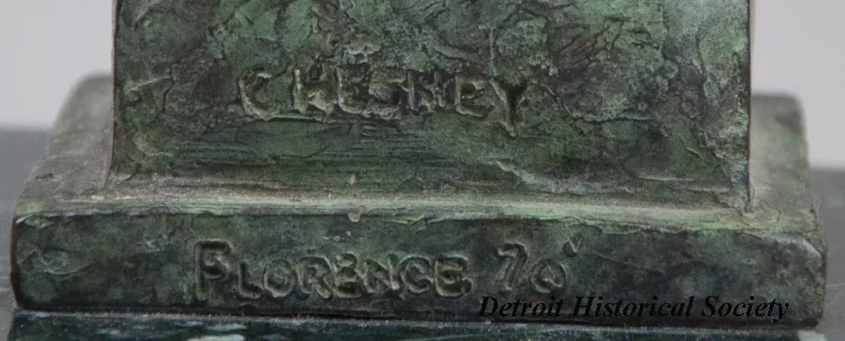 One small bronze bust of a young Italian boy. The brown metal sculpture has a green patina and a slightly rough finish. It shows the head and partial shoulders of an Italian boy who is wearing a floppy hat, a shirt with a tall collar, and a large cravat. The sculpture includes a small square bronze base that has been mounted on a larger square, dark green/black marble base. The artist has signed his name, "Chesney," and "Florence 70" on the back of the sculpture at the bronze base.