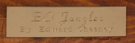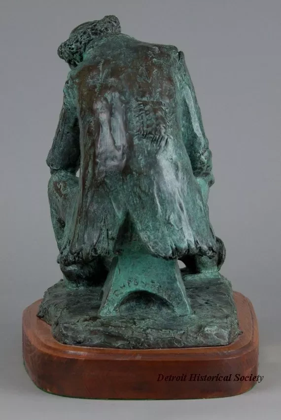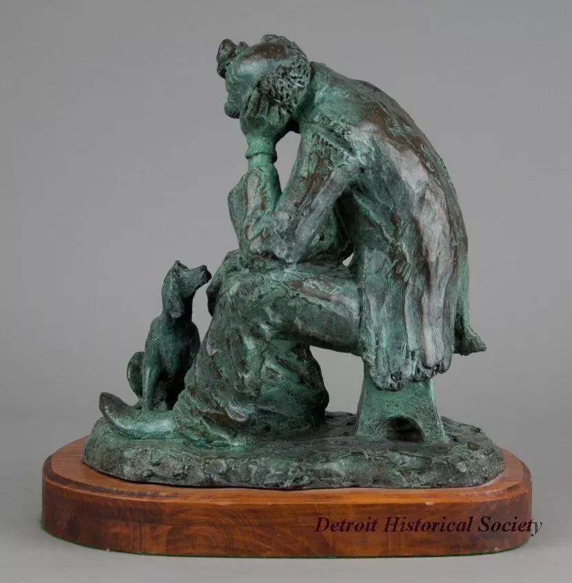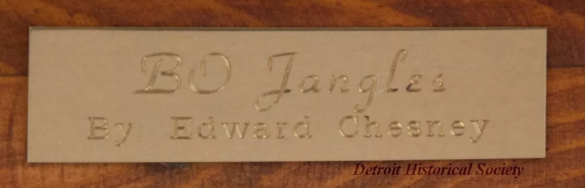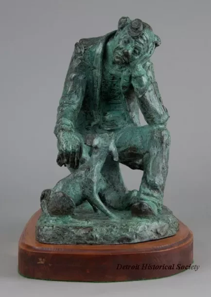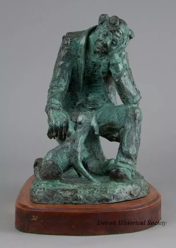 One bronze sculpture of the circus clown, "Bo Jangles." The brown metal sculpture has a green patina and a slightly rough finish. It shows the figure of a tired circus clown who is seated on a small stool and is looking at a small dog that is seated near his right knee. The clown is wearing a tiny hat, a big round nose, a ragged and patched jacket, and worn pants. The sculpture includes a rough, rectangular bronze base that has been mounted on a thick, pine wood base. The wood base has a plain routered edge and rounded corners. It has been stained light brown and finished with clear lacquer or varnish. The artist has signed his name, "Chesney," on the back of the stool on which the clown is seated. An engraved brass plate on the front of the wood base reads "Bo Jangles, by Edward Chesney."