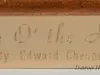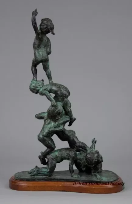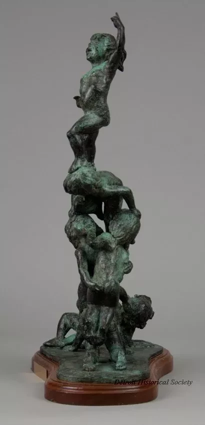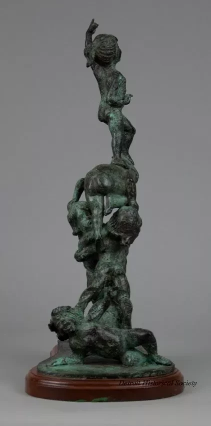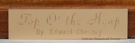 One bronze sculpture of children at play. The brown metal sculpture has a green patina and a smooth finish. It shows the figures of six nude children who are all clambering over each other in order to reach the top of a human pyramid. One young girl is standing at the top and has raised her left arm as a sign of victory. The sculpture includes a thin, irregular, oval-shaped bronze base that is mounted on a similarly-shaped mahogany wood base. The mahogany wood has a decorative routered edge and has been finished with clear lacquer or varnish. The artist has signed his name, "© Edward Chesney," on the top surface of the bronze base. Also, an engraved brass plate on the front of the base reads "Top O' the Heap by Edward Chesney."