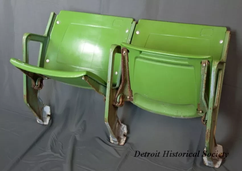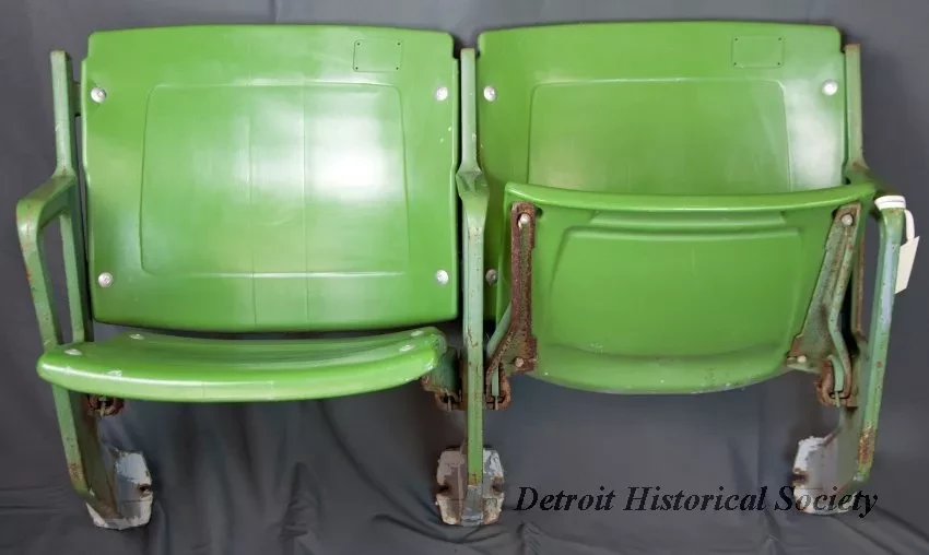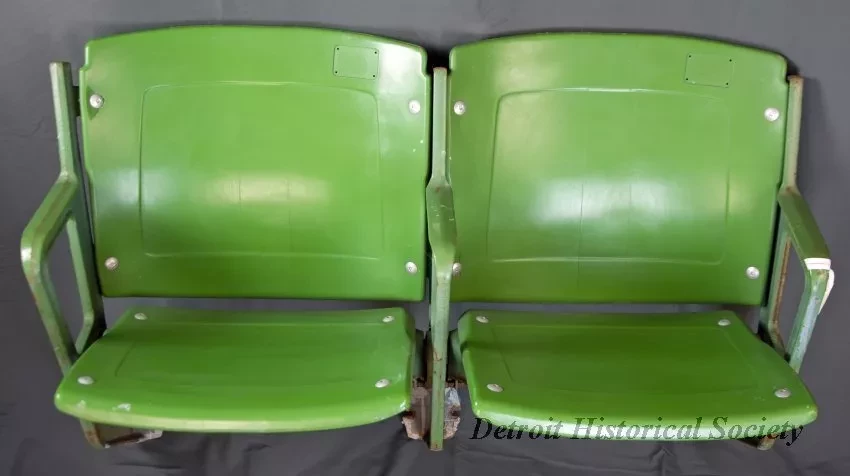 One pair of folding grandstand seats from the Hazel Park Raceway. The seat assembly consists of a heavy steel framework with armrests on the sides and mounting flanges at the bottom. The steel framework is painted green and has raised text on the sides that shows the numbers, "440 H," and "0081." Other text is illegible. The seat backs and bottoms are both made of thick, contoured green plastic and are attached to the steel framework with nuts and bolts. The seat bottoms are spring-loaded at the sides and automatically fold to an upright position when not in use. Seat tag numbers are missing from rectangular indentations located in the upper corner of each seat back. Raised text at the lower back edge of each seat back reads "American Seating," and "Pat. No. 3111343."