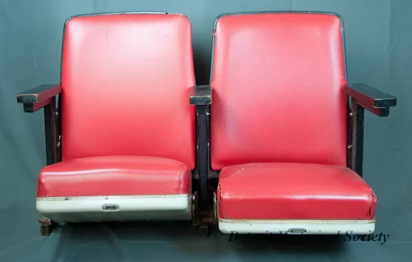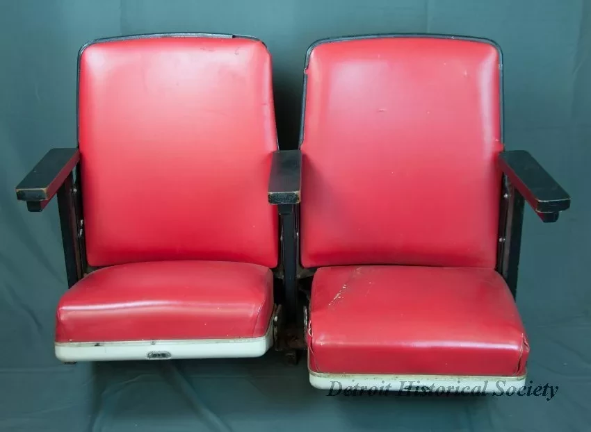 One pair of folding seats from Joe Louis Arena in Detroit. The seat assembly consists of a steel framework with armrest supports on the sides and mounting flanges at the bottom. Nuts and bolts have been used to attach the seat backs and bottoms to the framework. The steel framework is painted black. Armrests are made of rectangular pieces of wood that have been painted black and have a hard black plastic surface on top. Both the seat backs and bottoms are finished with padded red vinyl upholstery. The back sides of the seat backs have hard black plastic coverings and the undersides of the seat bottoms are made of steel that has been painted a tan color. The seat bottoms have internal spring mechanisms at the sides and automatically fold to an upright position when not in use. Seat tag number, "11," is shown at the front side of one of the seat bottoms and number, "12," is shown on the other. No manufacturer's name or marks are visible.