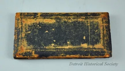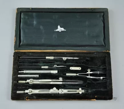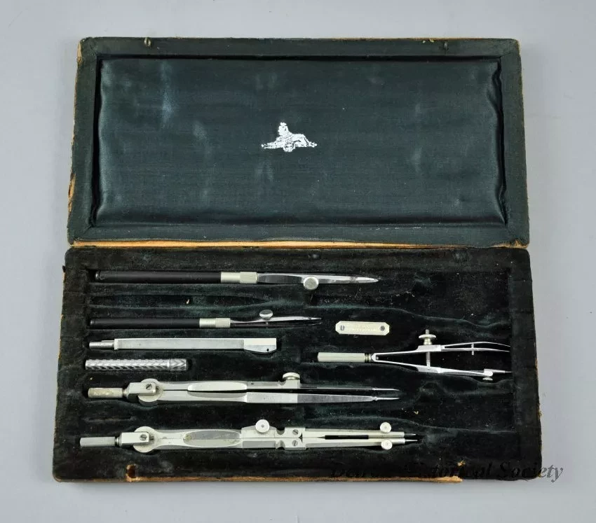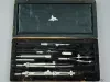 One small drafting set that was owned by Dr. Jack Kevorkian. The set includes dividers, a pencil compass with an extension arm, a small case for pencil lead, an ink compass, and two ink pens with variable-width tips for drawing lines. The precision-made tools were made of nickel-plated brass by "F. Weber & Co., Philadelphia." They are contained in a rectangular case that has a wood frame, a hinged lid, a brown leather exterior covering, and a fitted interior with a black velvet lining. A small embossed metal tag with the manufacturer's name is attached to the inside of the case with two screws.