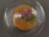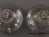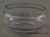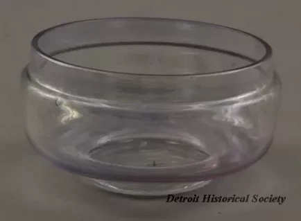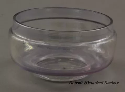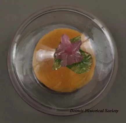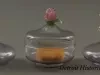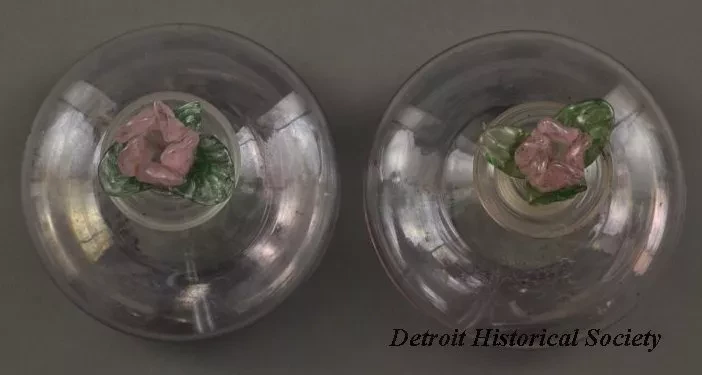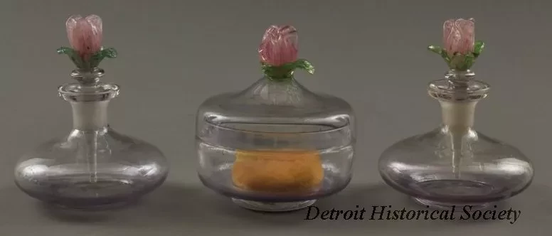 Vanity Set. A three piece faintly violet hued blown glass. Objects a and b are possibly perfume or cologne bottles; featuring a short wide body, slim neck and fluted lip; glass at the neck is frosted. Perfume bottles have stoppers and dauber with a thin narrow body at the base and widest portion to stopper the bottle. The tops of the stoppers feature blown glass opaque pink flowers and green leaves. Object c is a powder container that consists of two parts, body and lid. Lid features a blown glass top handle which is formed by opaque glass pink flower bud and green leaves. The belly of the container is round and features a small base. "Czechoslovakia" etched on bottom of all three pieces.
