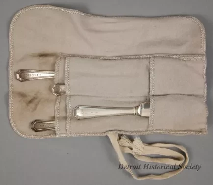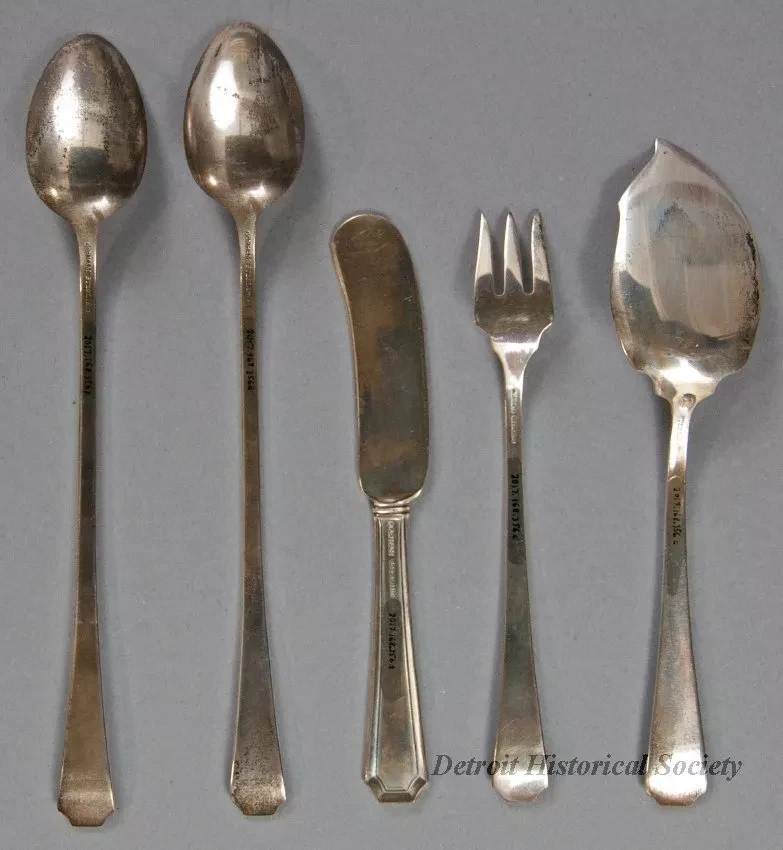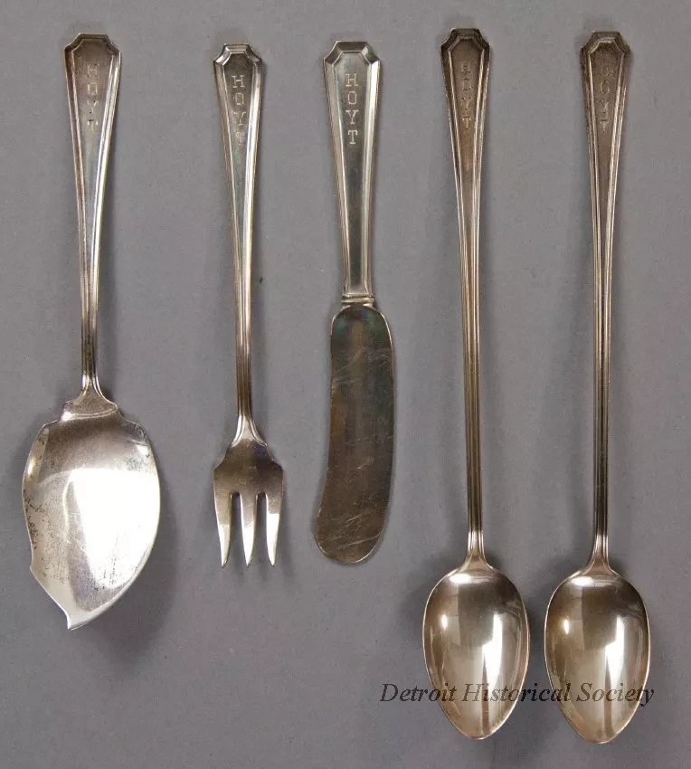 One 5-piece set of accessory tableware utensils which may have been used by the ship owner or namesake of the bulk carrier, SS ELTON S. HOYT II, of Pickands Mather & Company. The matching sterling silver set was made by Gorham in the "Fairfax" pattern. The set consists of 2 iced teaspoons, one large butter serving knife, one individual butter knife, and one seafood/relish fork. The tapered handles all have a matching traditional design and are engraved with the name, "Hoyt," at the upper end. Handle undersides are stamped "Gorham Sterling." The utensils are all held in a fitted protective light tan/gray fabric pouch.