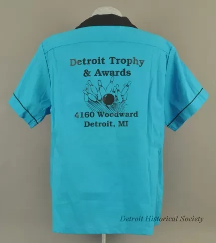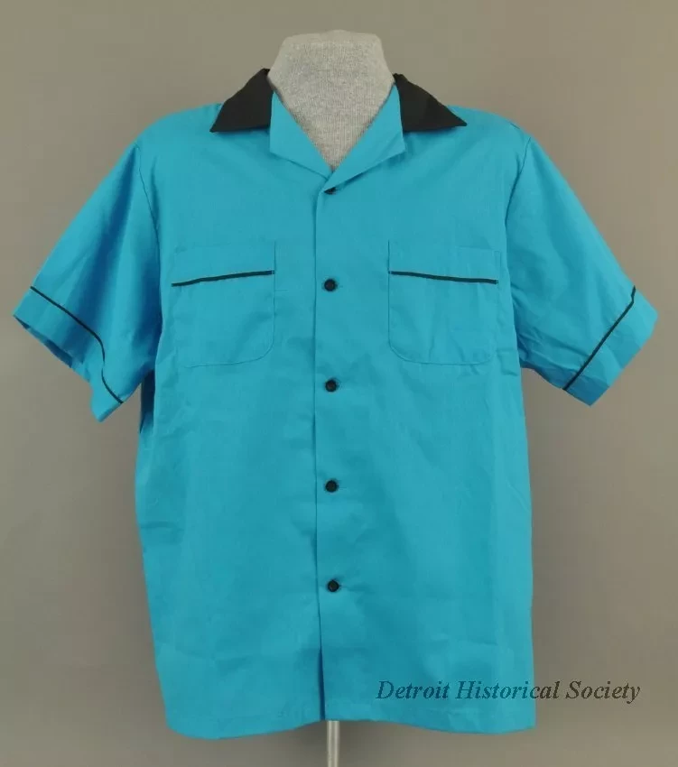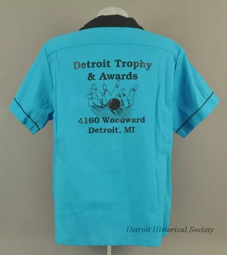 One man's bowling shirt. The short-sleeve shirt is turquoise is color with a black collar, black piping on the sleeves and front pockets, and single pleats with black trim strips on the sides. It has an open collar with five black plastic buttons down the front. Black iron-on text on the back of the shirt shows "Detroit Trophy & Awards, 4160 Woodward, Detroit, MI" and includes a drawing of a bowling ball striking pins. The inside back collar has one black tag that shows "Hilton Bowling Retro." A white tag shows size "Large," washing instructions, and the fabric components, 50% cotton and 50% polyester.