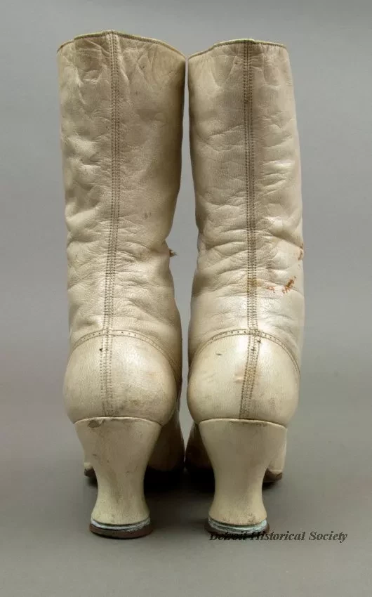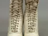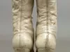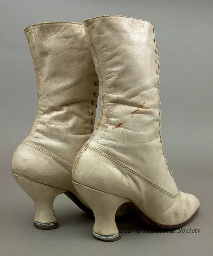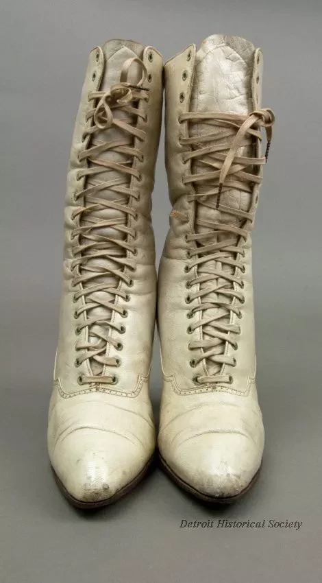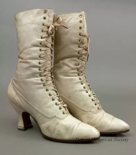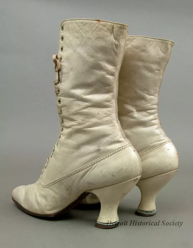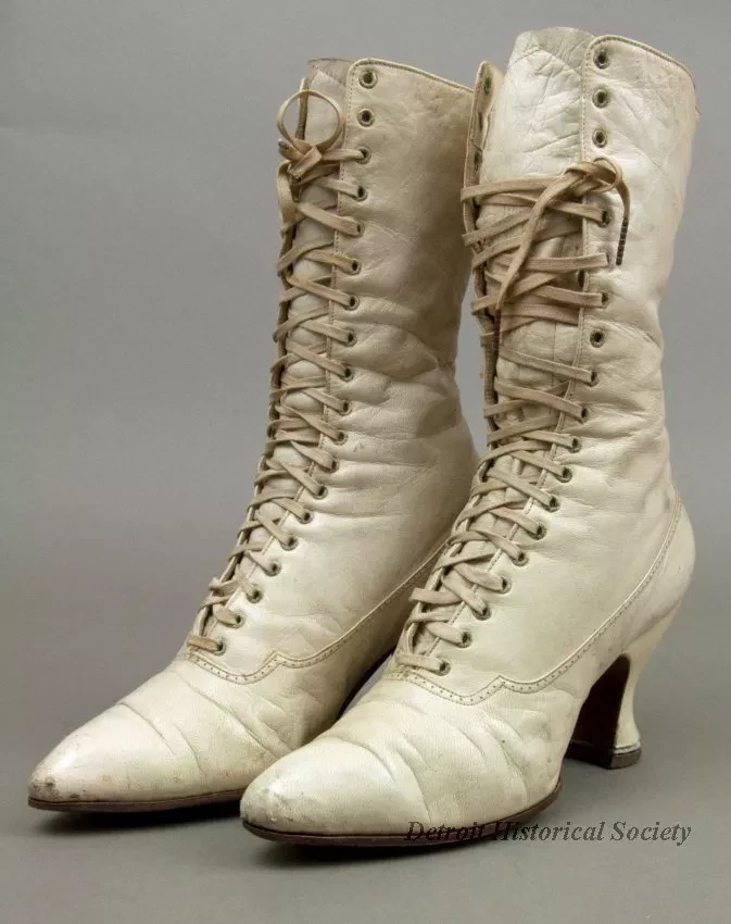 One pair of women's high laced wedding shoes. The shoes are made of white kid leather, with a pointed toe and 2.5" French heels. The shoes have a minimal design, with a stitch lining the vamp and sides of the shoe. This stitch features tiny perforated holes as a minor decoration. There are nineteen eyelets on either side of the center of the shoe, with thirty eight eyelets in total. A silk lace runs through the eyelets and ties at the top of the shoe. The interior of the shoe is lined with tan fabric.