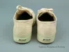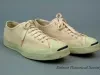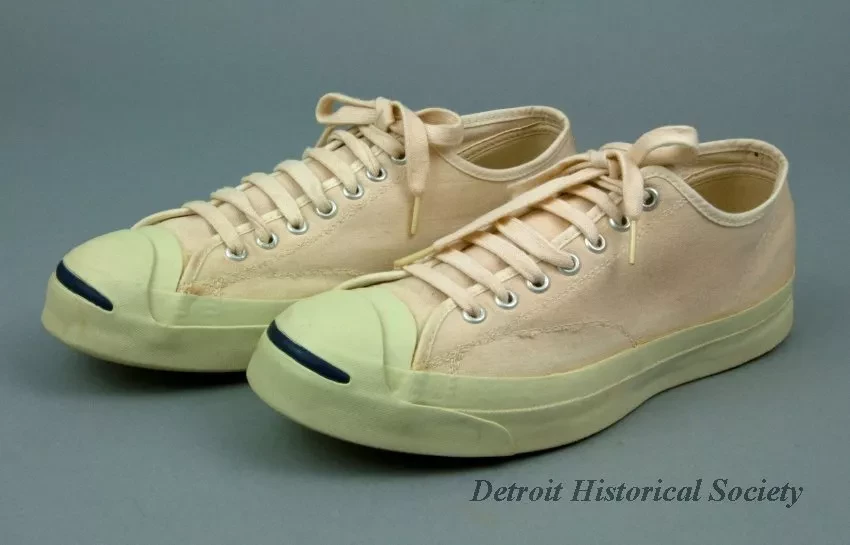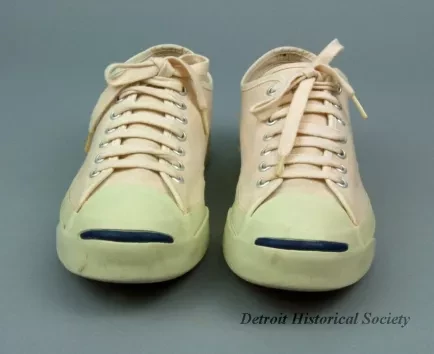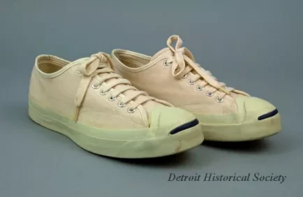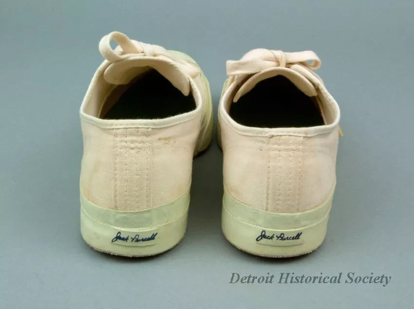 One pair of men's white canvas tennis shoes. The shoes have white canvas tops with metal eyelets for white shoelaces as well as wide protective white rubber strips along the sides of the soles and a short blue stripe at the toe. The heels have rectangular white labels with a blue facsimile signature that shows "Jack Purcell." The inside soles of both shoes have stamped text that reads "Posture Foundation, Sanitized." Also, the letters, "PF," are stamped on the left inside sole. The exterior soles have a smooth rubber surface with a blue and red label inset at the center that reads "B.F. Goodrich, Jack Purcell, Made in U.S.A."