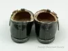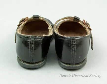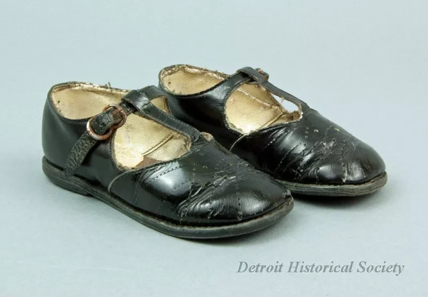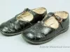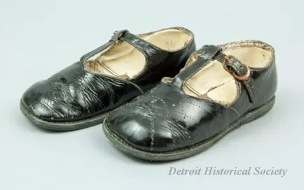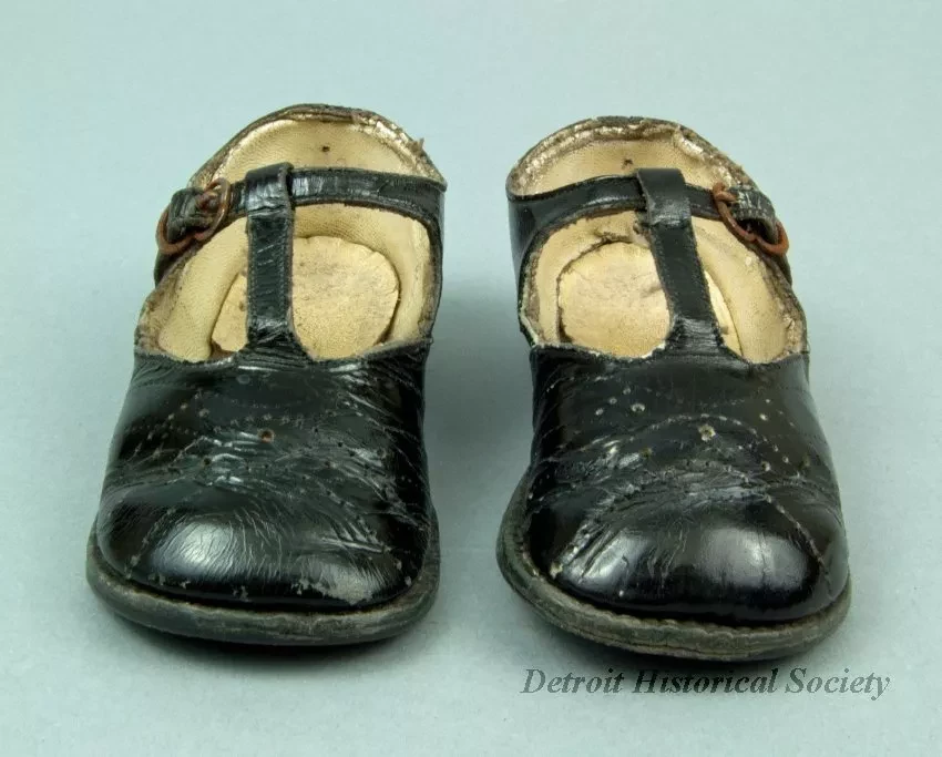 One pair of young girl's black patent leather shoes. The shoes have leather soles, black rubber heels, a decorative hole pattern on the vamp, and a T-strap across the top with a chrome-plated steel buckle at the side. A manufacturer's name is not shown.