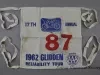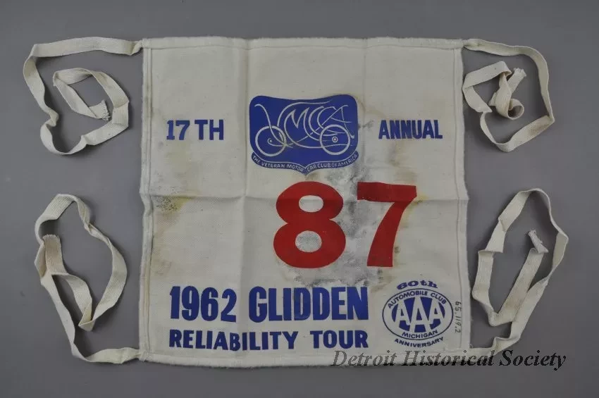 1-Tour Number Sign. Made of flannelette-backed light cotton duck with cotton tapes attached to the corner to tie the sign to the door of an antique car in tour. For "17th Annual, 1962 Glidden, Reliability Tour". Has 4.5" high red numerals "87" in the center, slightly off-set to the right. In the top center, there is a blue crest of the V.M.C.C.A.. In the lower right corner the blue emblem of AAA.