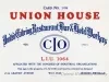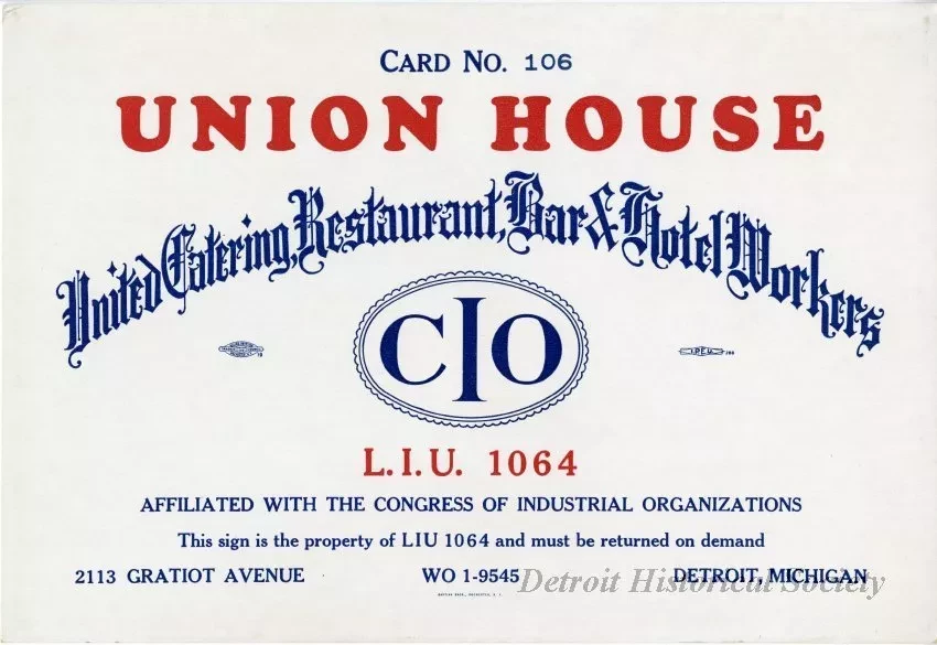 Union House Sign. Rectangular cardstock sign from the United Catering Restaurant, Bar, and Hotel Workers, L.I.U. 1064 Union House. The logo of the Congress of Industrial Organizations is in the center. "2113 Gratiot Avenue, WO 1-9545, Detroit, Michigan," is printed along the bottom. The sign is printed in red and blue on a white background, and uses a combination of typefaces included a black letter one for the union's name.