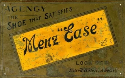 One advertisement sign for "Menz Ease" shoes that were made by the Menzies Shoe Company of Detroit. The rectangular sign is made of sheet brass with engraved text that reads "Agency, The Shoe That Satisfies" as well as "Menz Ease" and "Look For This Label." The text is painted black. Text at the center of the sign is shown on a rectangular painted yellow background. Small screw/nail holes are located at each corner for mounting the sign on a wall or other surface.