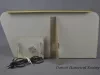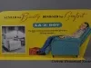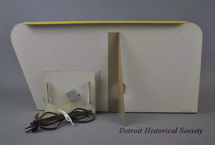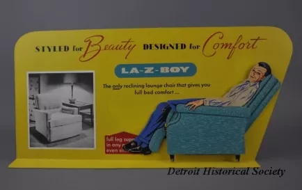 One animated advertisement sign display for "La-Z-Boy" chairs. The sign is made of heavy yellow cardboard and has red, black, and blue text that advertises the La-Z-Boy reclining lounge chair. A black and white photographic image shows the chair in a living room setting on the left side of the display board. An animated three-dimensional figure of a man who is seated in a blue lounge chair is shown on the right side of the board. A small electric motor on the back of the display board causes the chair to recline and return to an upright position. The motion continues to repeat as long the motor is plugged into a wall socket via the attached electrical cord. A fold-out cardboard stand is attached on the back of the sign to hold it upright on a flat surface.