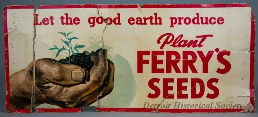 One advertising sign for "Ferry's Seeds." The rectangular sign is made of cardboard. It has a red border and a tan background. Printed red text reads "Let the good earth produce," and "Plant Ferry's Seeds." A multi-color drawing of a right hand holding a seedling is shown at the left side of the sign. Small printed text in the lower right corner reads "Copyrighted 1943, Ferry-Morse Seed Co., Litho in U.S.A." Two foldout cardboard props (broken) are located on the back so that the sign could be self-standing on a shelf or counter.