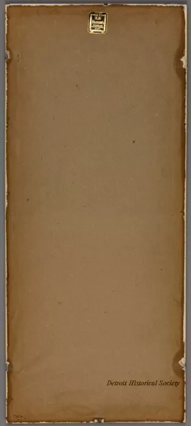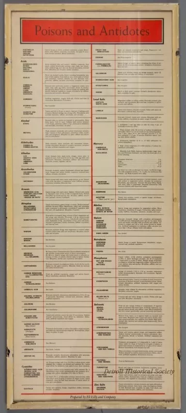 One framed informational sign from the 14th floor hospital at the downtown Detroit Hudson's store. The rectangular sign, "Poisons and Antidotes," is printed in black text on white paper. Various harmful chemicals and drugs are listed alphabetically in two columns and adjacent text gives methods of treatment for the ingested substances. Column lines are printed in red ink and row lines are black. Printed text along the lower edge of the sign reads "Prepared by Eli Lilly and Company." The sign is held in a narrow wood frame, painted white, along with a pane of protective glass.