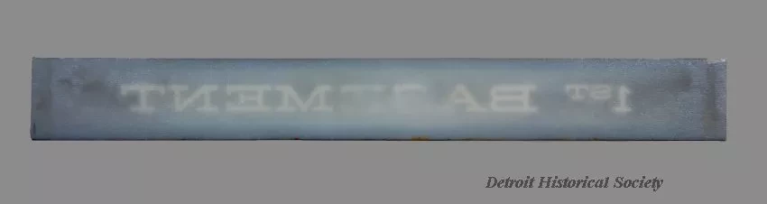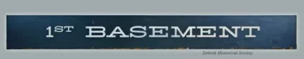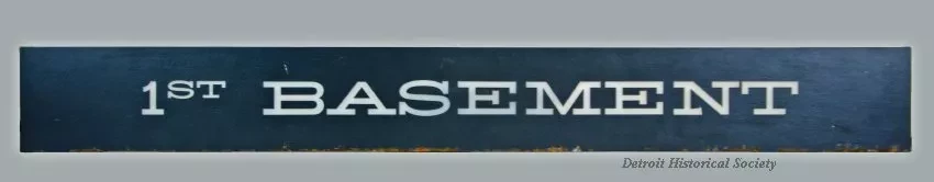 One informational sign from the "1st Basement" budget store of the downtown Detroit Hudson's store. The long, rectangular sign is made of 0.25-inch thick opaque white glass. It has white lettering on a painted background that is of a dark charcoal gray color. The back of the glass is unpainted and has a slightly rippled surface. The sign was likely held in a metal frame enclosure and was illuminated from behind.