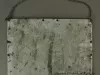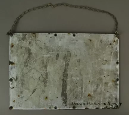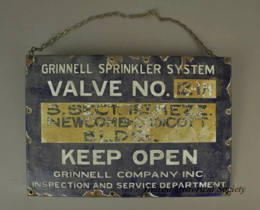 One enamelled steel sign from the Grinnell Company store in downtown Detroit. The rectangular sign has white enamel text on a blue enamel background that shows "Grinnell Sprinkler System Valve No. 12-1M" and "Keep Open, Grinnell Company, Inc., Inspection and Service Department." Black text on a yellow background shows valve number "12-1M" and "S. Sect. 1st Mezz., Newcomb-Endicott Bldg." A steel chain is bolted at the top corners of the sign in order to allow it to be hung from the noted valve. Several holes are located along each edge of the sign to provide various attachment points. The back of the sign has a white enamel finish.