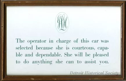 One informational sign from an elevator in Hudson's downtown Detroit department store. The sign is printed in green text on white paper and reads "The operator in charge of this car was selected because she is courteous, capable and dependable. She will be pleased to do anything she can to assist you." The sign has a protective glass cover and is held in a narrow, decorative mahogany wood frame that has a brown stain finish.