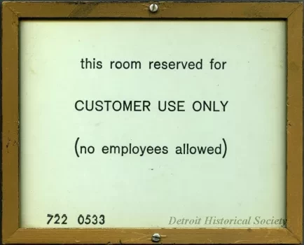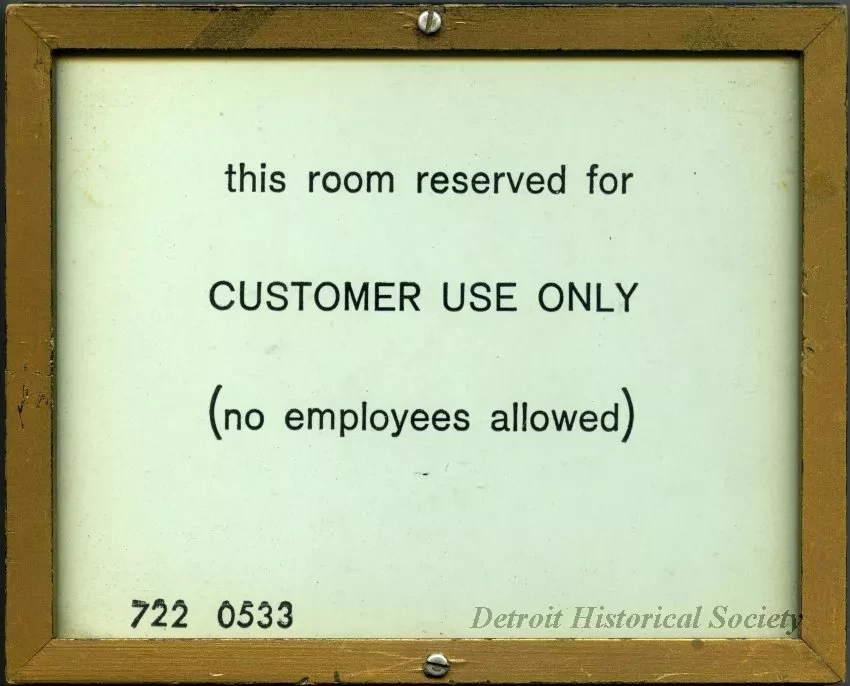 One informational sign from Hudson's downtown Detroit department store. The rectangular sign is printed in black text on white paper and reads "This room reserved for Customer Use Only (no employees allowed)." Also, the telephone number, "722 0533," is shown in the lower left corner. The sign has a protective glass cover and is held in a plain wood frame that has been finished with gold-colored paint. One pan head screw is located on both the upper and lower frame edge so that the sign can be mounted on a wall.