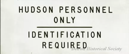 Wooden backed sign of white laminate with black routed lettering, from a J.L. Hudson's Department store reading "Hudson Personnel Only Identification Required." The back of the sign is covered with duct tape.