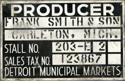 Detroit Municipal Markets metal stall registry sign for Frank Smith and Son of Carleton, Michigan. The sign is stenciled with their stall number, 203-E 2, and their sales tax number, 123867.