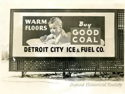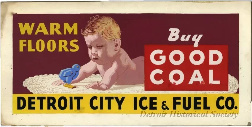 Hand-painted advertisement on heavy cardstock for the Detroit City Ice and Fuel Company painted by Herman G. Jahnke of Walker and Company, and entered into the 16th National Competition and Exhibition of Outdoor Adverting. The sign depicts a baby laying on a small white rug, playing with a blue toy bird. The surrounding text reads, "Warm Floors," "Buy Good Coal," and "Detroit City Ice & Fuel Co." An entry form has been affixed to the verso of the board: