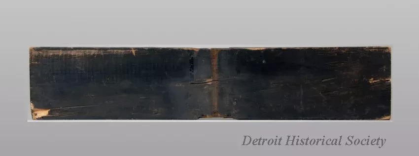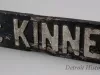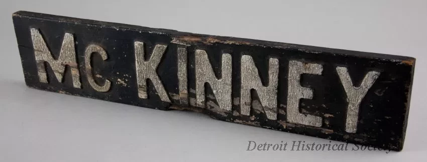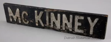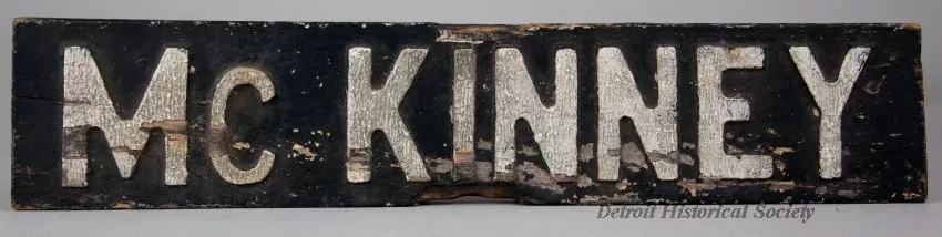 One street sign for McKinney Street in Detroit. The rectangular sign is made from a 3/4-inch thick wood plank (possibly pine wood). The wood has been painted black and has raised lettering on one side that reads "McKinney." The top surface of each letter has been painted with a reflectorized white paint.