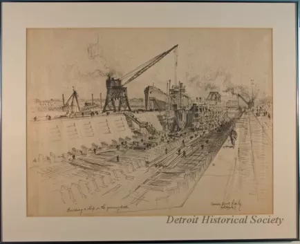 One framed charcoal/pencil sketch of a ship under construction in a graving dock. The sketch shows a view along the dock with scaffolding, construction materials, workmen, and large cranes. Handwritten text along the lower left edge shows the title, "Building a Ship in the Graving Dock." The artist has signed his named, "Vernon Howe Bailey, Ashtabula, '19." in the lower right corner. The sketch is held in a narrow black metal frame with a white matte border.