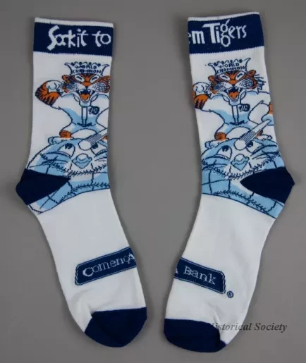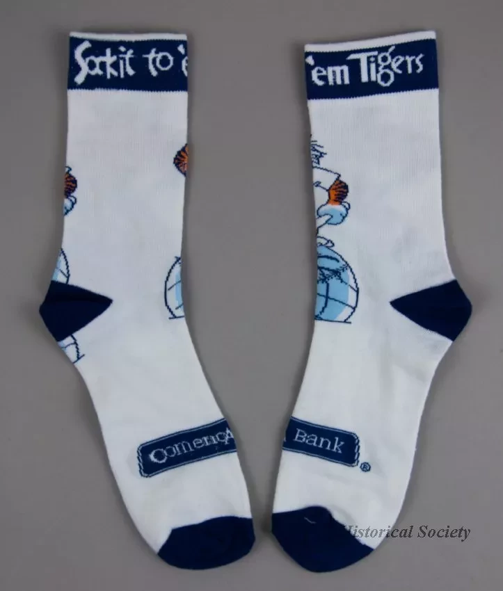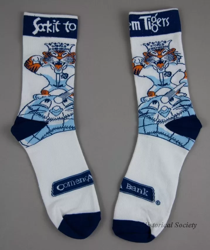 One small pair of socks that were made in commemoration the 50th anniversary of the Detroit Tigers World Series win in 1968. The socks are made of white polyester fabric with blue/orange/white sewn designs on the outsides that depict a Detroit Tiger mascot player with a "World Champion" crown and a large baseball that resembles a globe. The socks have blue toes and heels as well as blue bands at the tops with white lettering that reads "Sock it to 'm Tigers." A blue/white "Comerica Bank" logo apears on the top of each sock near the toe.