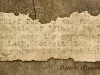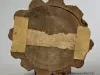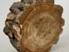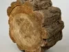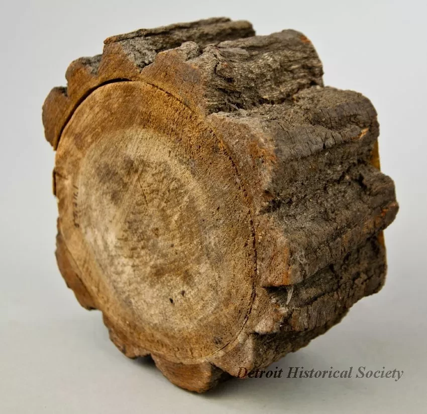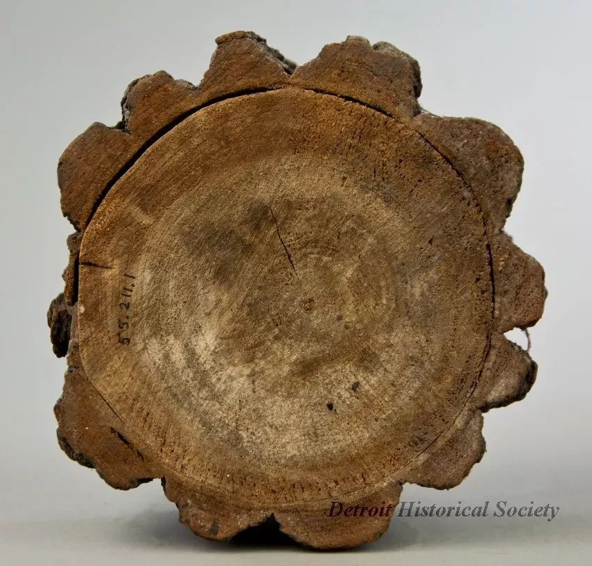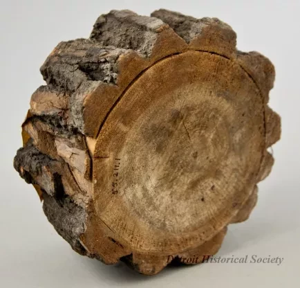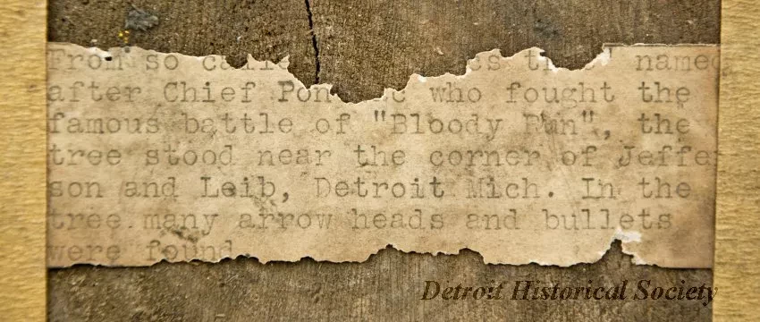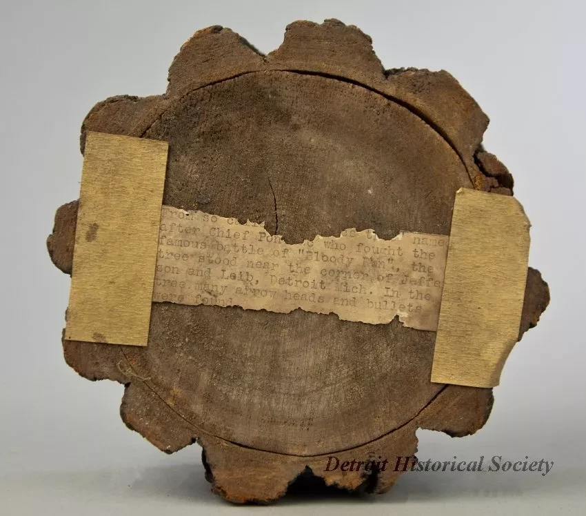 One souvenir cross-section of a tree limb that was taken from "Pontiac's Tree" which was located at the site of the Battle of Bloody Run. The 2.75-inch thick, 6-inch diameter cross-section shows the darkened (elm?) wood end grain on two faces with bark around the perimeter. A paper label on one of the faces has black typewritten text that is partially readable and shows "From the so called --- tree --- named after Chief Pontiac who fought the famous battle of 'Bloody Run'; the tree stood near the corner of Jefferson and Leib, Detroit, Mich. In the tree many arrowheads and bullets were found."