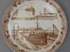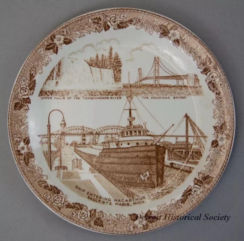One souvenir plate from northern Michigan. The round plate is made of glazed white china. It has a flat, narrow, slightly-upturned rim that is stamped with a decorative, sepia-toned floral and leaf pattern. The center of the plate is printed with three sepia-toned drawings of popular tourist sights including Tahquamenon Falls, the Mackinac Bridge, and the ship locks at Sault Ste. Marie. Short captions are shown beneath each drawing. The plate underside is stamped with a crossed U.S./Canada flags logo and sepia text that reads "Northern Michigan Scenic Wonderland" and "Old English Staffordshire Ware." One small logo is also shown with additional text that reads "Jonron, England," as well as "Made in Staffordshire, England" and" Imported Exclusively for Bell Tourist Enterprises, Sault Ste. Marie, Mich."
