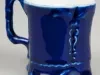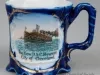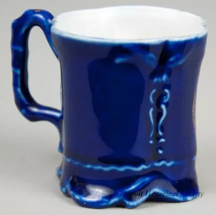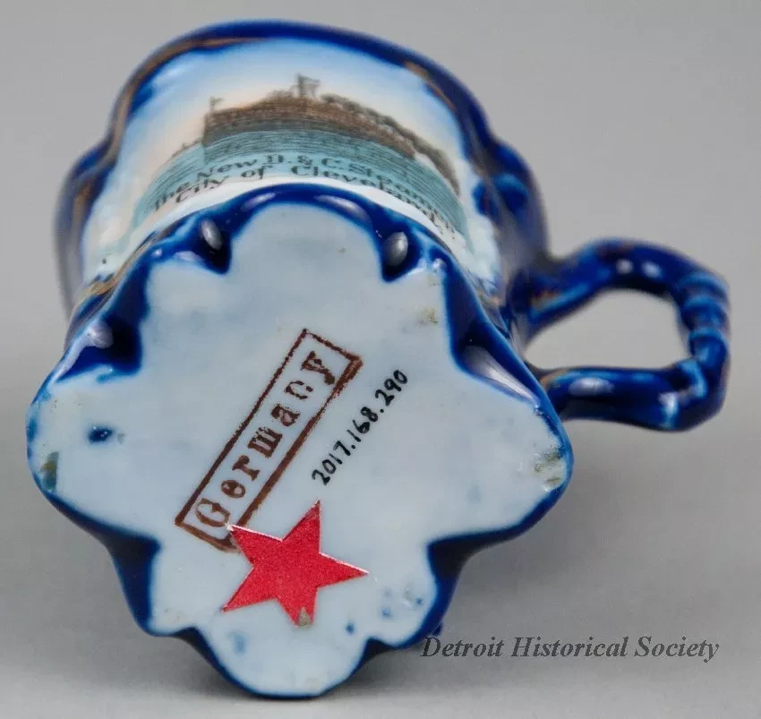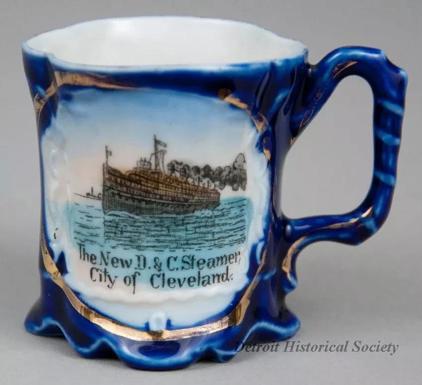 One souvenir cup from the passenger steamship, SS City of Cleveland, of the Detroit and Cleveland Navigation Company (D&C Line). The miniature demitasse cup is made of white glazed china that has been painted cobalt blue on the exterior. It has a cylindrical body with four vertical indentations, a flared top rim, a small handle on one side with a scrollwork design, and a decorative flat bottom. A circular, multi-color image is printed on one side of the cup that depicts a port side bow view of the SS City of Cleveland underway in fair weather. Narrow gold-colored stripes are painted on the handle and around the printed image. Black text beneath the image reads "The New D&C Steamer, City of Cleveland." A black ink stamp on the bottom of the cup reads "Germany."