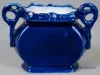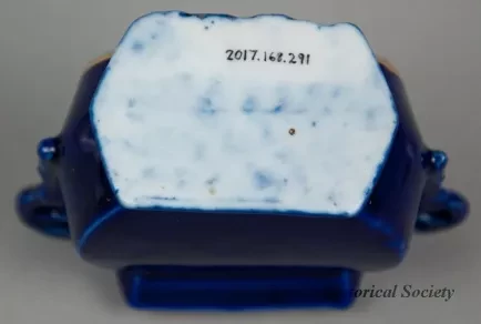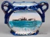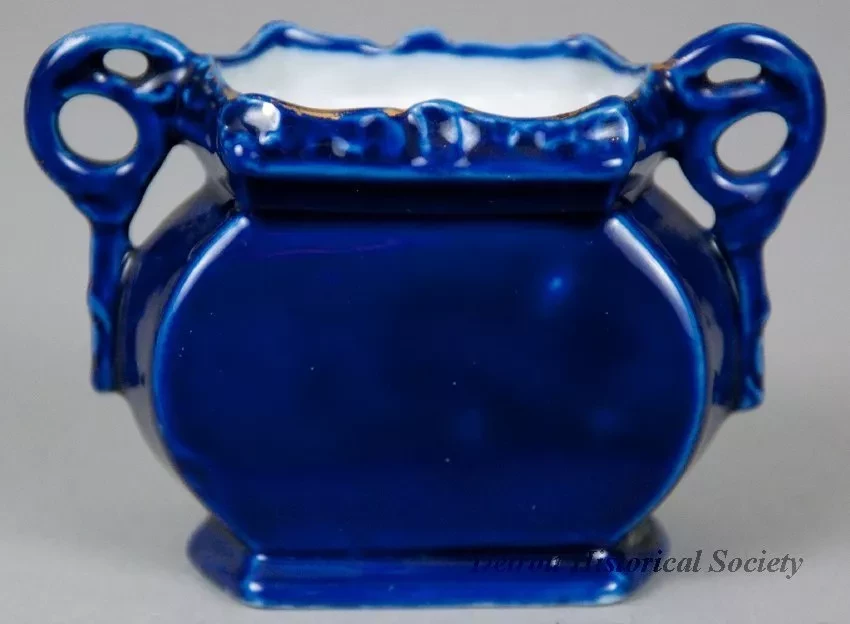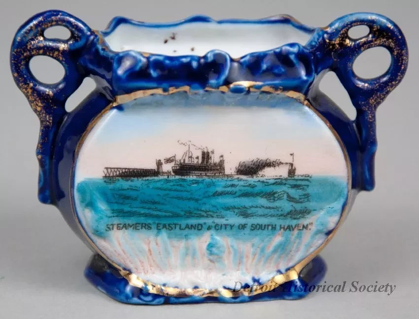 One souvenir vase from the passenger steamships, SS Eastland and SS City of South Haven. The miniature vase is made of white glazed china that has been painted cobalt blue on the exterior. It has a flat, oval-shaped body with a decorative rectangular top rim, small handles on opposite sides with scrollwork designs, and a decorative flat base. An oval-shaped, multi-color image is printed on one side of the vase that depicts a stern view of the two steamships leaving the harbor in fair weather. Narrow gold-colored stripes are painted on the handles, the base, and around the printed image. Black text beneath the image reads "Steamers Eastland & City of South Haven." No manufacturer's name or marks are shown.