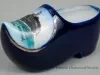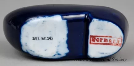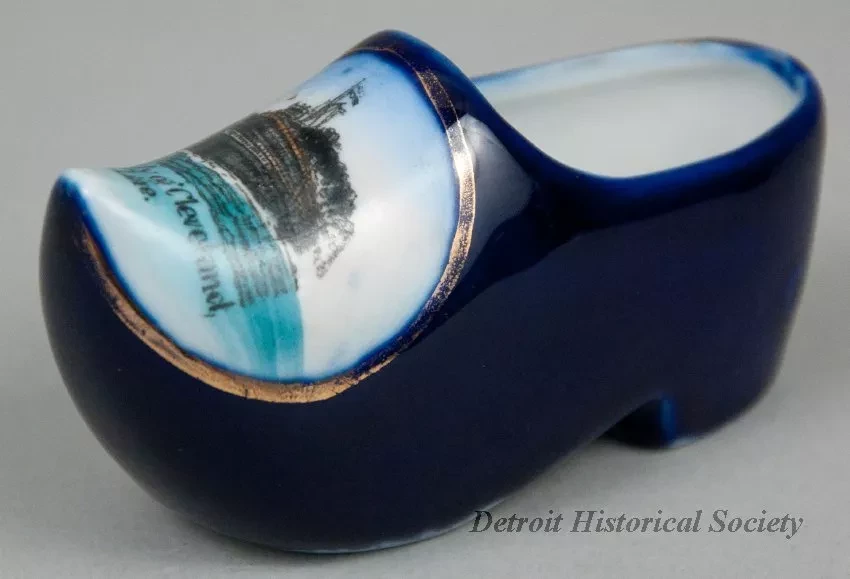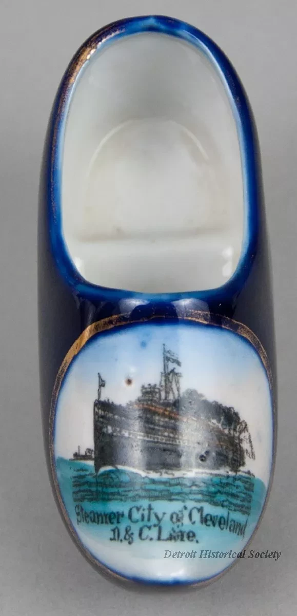 One small souvenir shoe from the passenger steamship, SS City of Cleveland, of the Detroit and Cleveland Navigation Company. It resembles a Dutch wooden shoe and is made of white glazed china that has been painted cobalt blue on the exterior. A circular, multi-color image of the passenger steamship, SS City of Cleveland, is printed on the vamp. Small black text beneath the image reads "Steamer City of Cleveland, D&C Line." A narrow gold-colored stripe encircles the image. A red ink stamp on the bottom of the heel reads "Germany." No manufacturer's name or marks are shown.